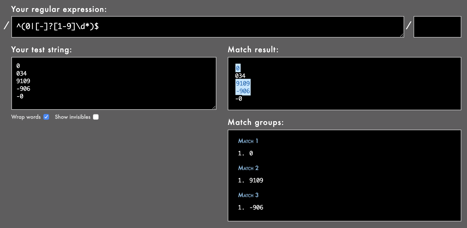 바꾸는 김에 살짝 다듬어보자. [1-9]+ 에 붙은 + 표시는 사실 뒷부분과 중복되는 표현이라 빼버려도 되고, [0-9]까지의 숫자 허용은 \d 와 같다. 여기에, 가장 앞에 음수기호(-) 가 있을 수도 있다는 표현식 [-]? 이걸 추가하자.