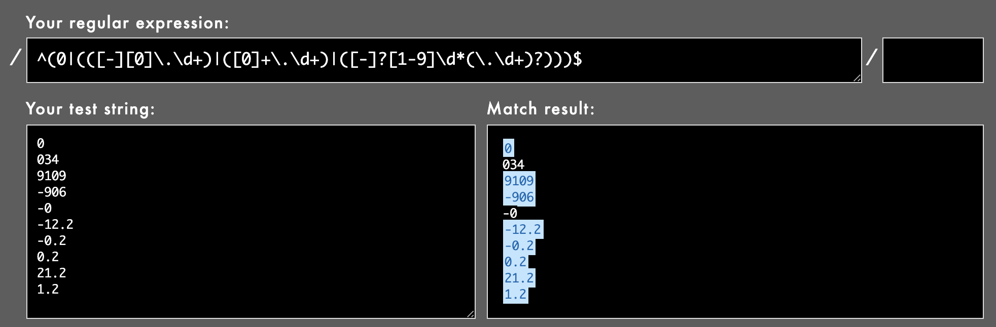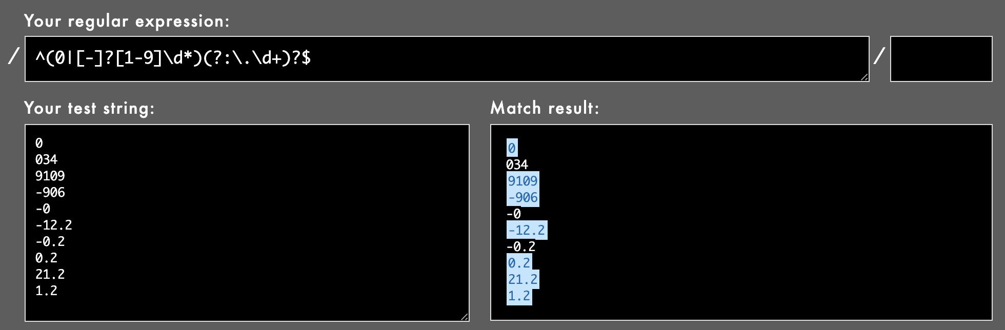 다른 부분은 잘 통과했지만, -0.2 이 녀석이 안된다. 앞쪽에 설명했듯이 음수 표현식에서 '-0' 와 같이 숫자 0에 음수기호(-)는 허용하지 않았기 때문이다. 지금처럼 소수를 포함하는 정규식이 되면 이야기가 달라진다.