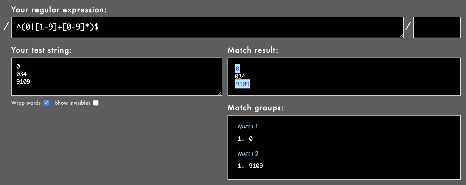 Match result 를 살펴보면 알 수 있듯이 , '034' 와 같이 가장 왼쪽 문자열이 0으로 시작되는 숫자 문자열은 허용하지 않는다.